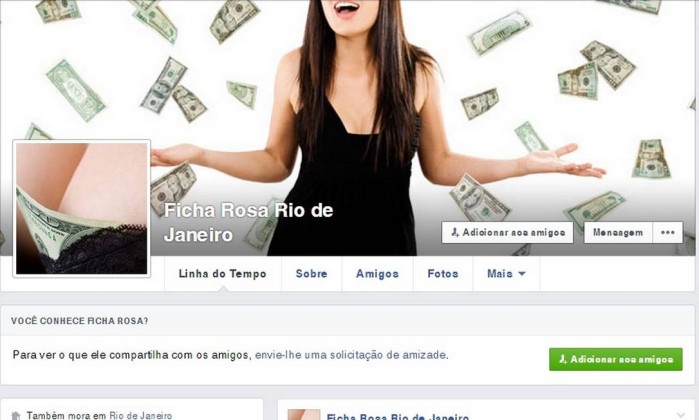 Um universo paralelo, aparentemente livre dos filtros que já levaram a rede social a bloquear imagens de nudez, mesmo que o pelado em questão fosse um bebê, como aconteceu em julho de 2011, quando a rede social censurou a capa do álbum Nevermind, do Nirvana, há páginas voltadas à promoção de encontros com “clientes nível AAA”, conforme ressalta a comunidade Ficha Rosa Rio de Janeiro. Criada em setembro passado, a timeline traz na capa a imagem de uma jovem sob uma chuva de dólares, no detalhe ao lado, cédulas aparecem em meio ao decote de uma mulher.