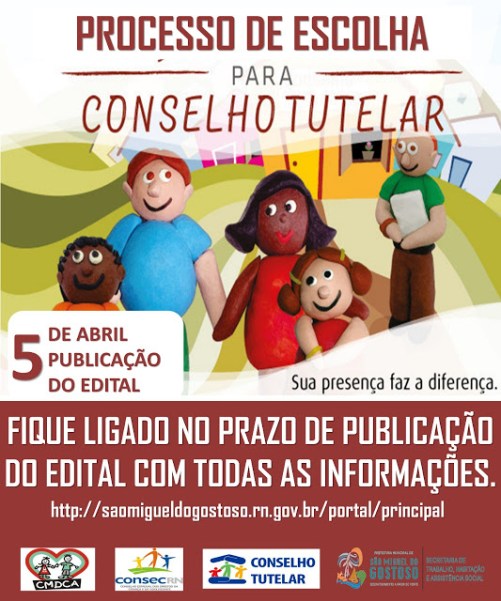 A escolha dos membros do Conselho Tutelar será no dia 06 de outubro de 2019 em todo território nacional, por isso o processo de escolha é unificado. Para os interessados fiquem de olho no site do CMDCA de São Miguel do Gostoso onde estarão sendo publicadas todas as informações referentes ao processo, assim como no Diário Oficial.