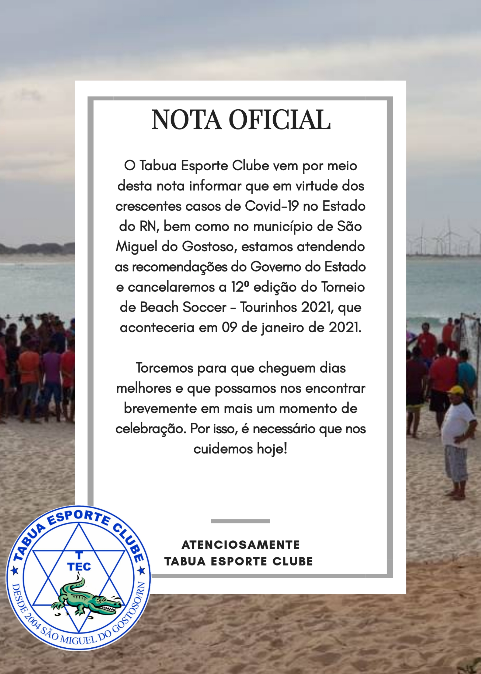 A 12ª edição do Torneio de Beach Soccer que aconteceria no dia 09 de janeiro de 2021 foi cancelada é o que diz a nota oficial do Tabua Esporte Clube (TEC) divulgada na manhã desta quinta-feira (10).
