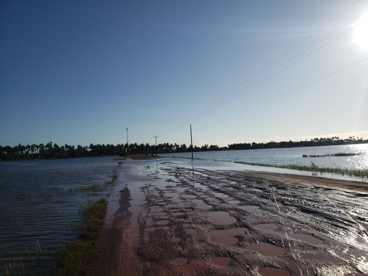 Após as chuvas que caíram em São Miguel do Gostoso entre a noite da última terça-feira (28) e a manhã da quarta-feira (29) o Aterro do Reduto voltou a transbordar por cima da estrada que o corta em pelo menos dois pontos. A última vez que o fenômeno havia sido registrado foi em 2018.