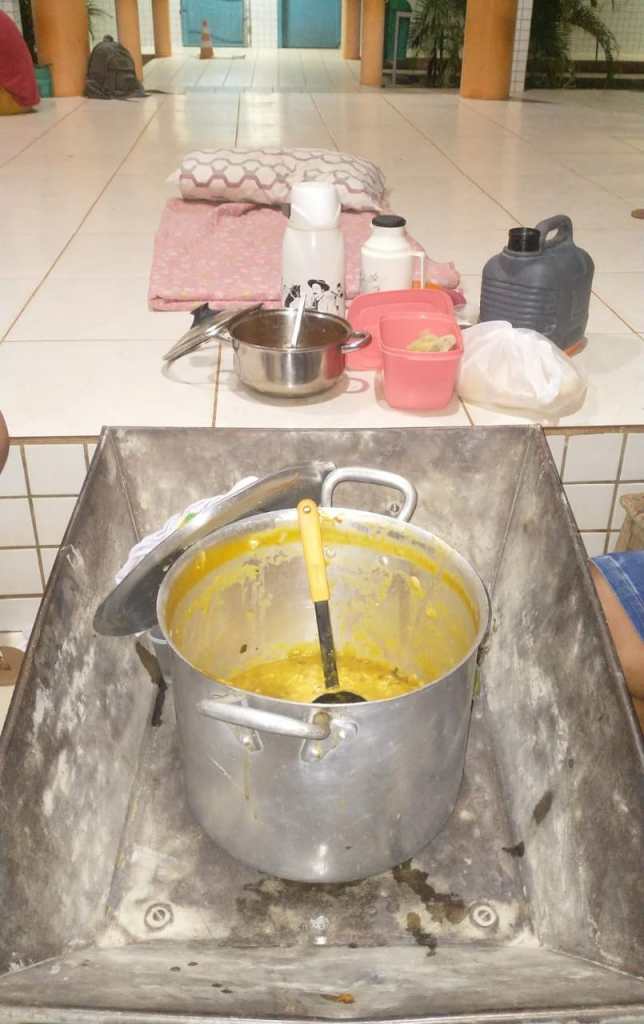 Infelizmente a cena não é novidade e voltou a se repetir esse ano, mas no episódio que viralizou nas redes sociais e chamou a atenção foi a organização de um jantar coletivo – um sopão como mostra a imagem – feito pelas mães de alunos da rede municipal e consumida dentro da escola ainda durante a noite.