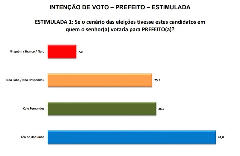 Na estimulada, a liderança de Léo de Doquinha com 41% e em segundo, aparece Caio Fernandes com 26,5%. Não sabe/não respondeu tem 25,6% e Ninguém/branco/nulo 7%