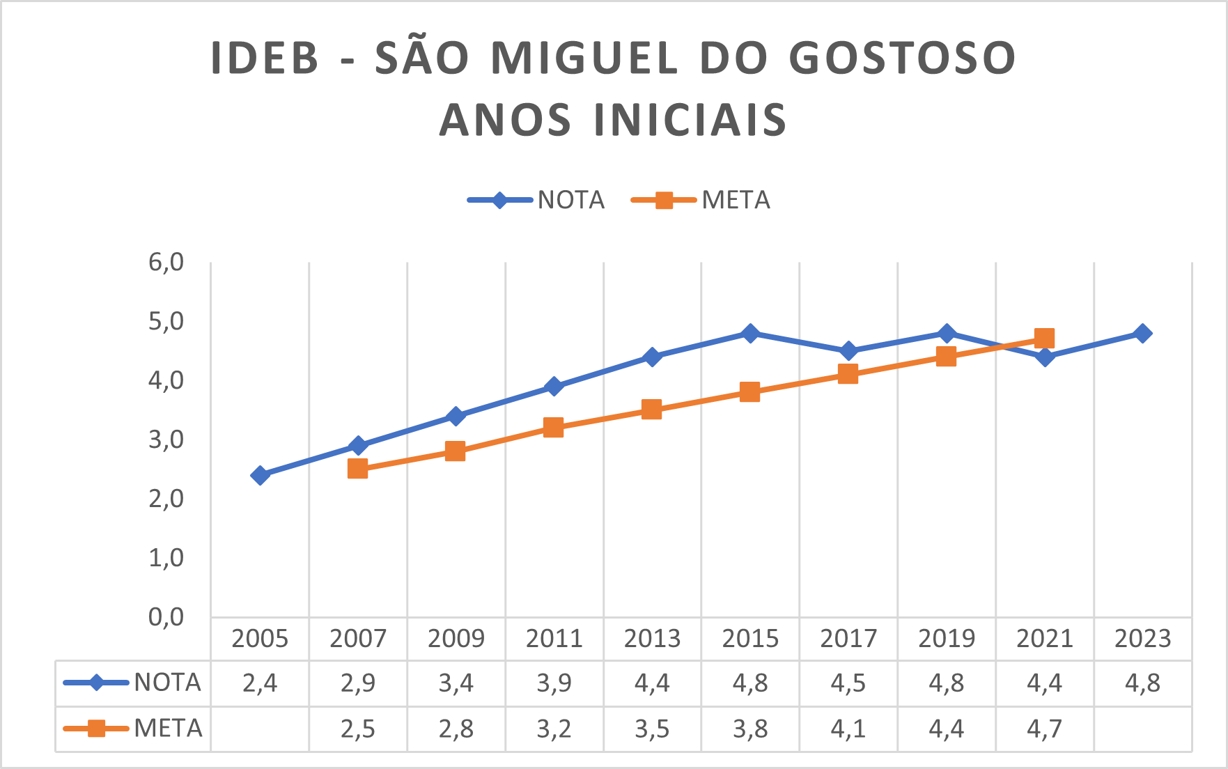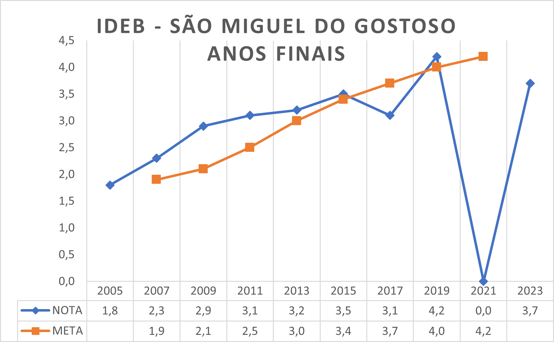 Uma observação a ser feita é que o INEP ainda não estipulou a meta do ciclo a partir de 2023. Segundo o site do instituto, as metas até então são referentes ao que se denomina primeiro ciclo do IDEB, que equivale de 2007 a 2021.
